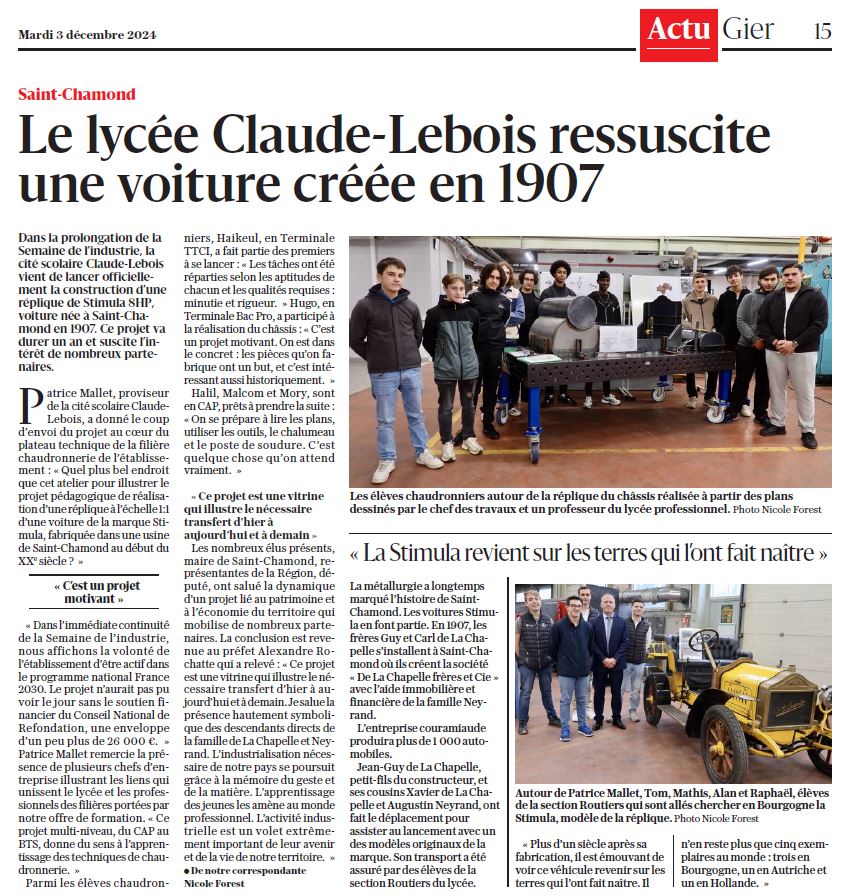 Le jeudi 28 novembre 2024, s'est tenue la cérémonie de lancement du projet de la fabrication à l'échelle 1 de la réplique de la voiture STIMULA qui a été fabriquée à Saint-Chamond à partir de 1907.